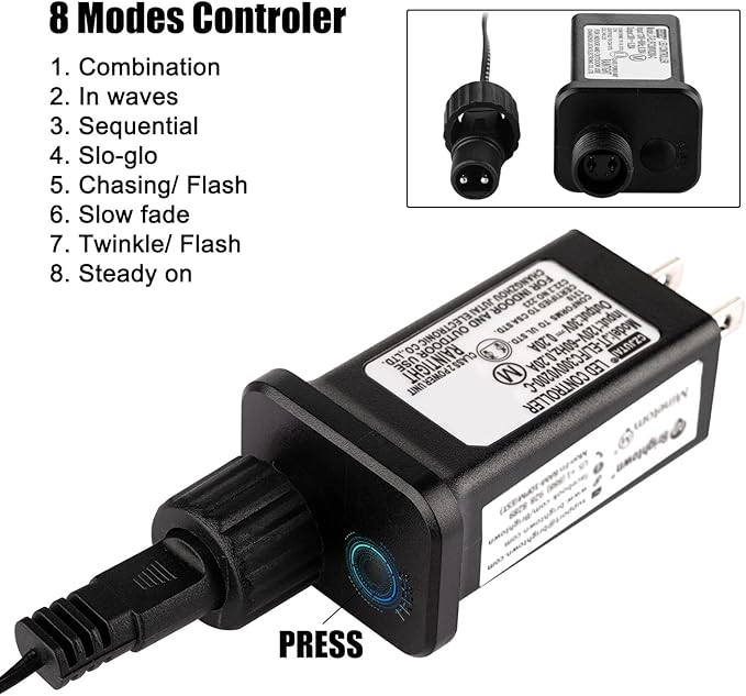 - 8 fantastic flashing modes: Press the press button on ac adapter repeatedly to select 1. combination, 2. in waves, 3. sequential, 4. slow glow, 5. chasing or flash, 6. slow fade, 7 .twinkle or flash or 8. steady on working mode