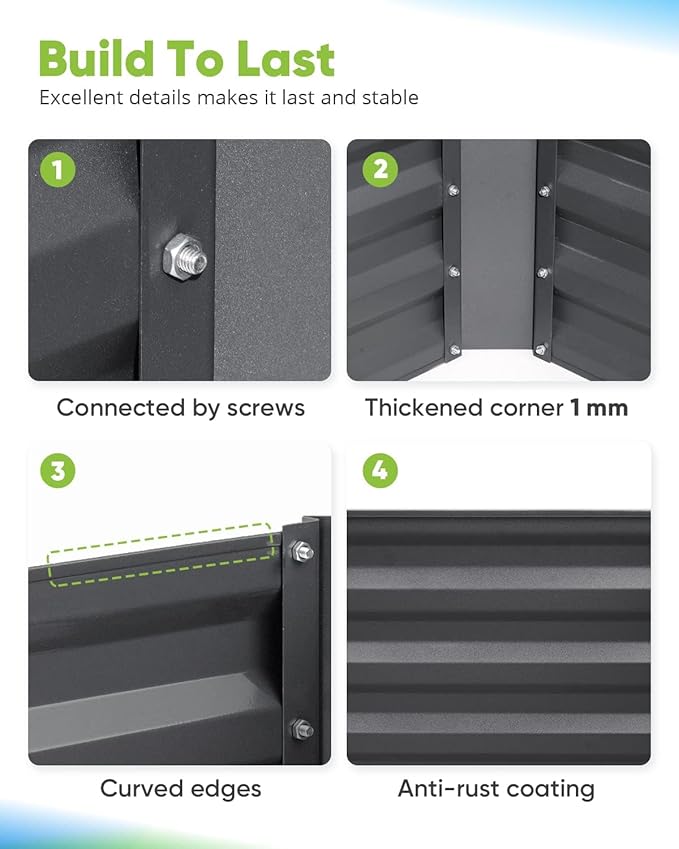 - 【Built To Last】Garden raised planting bed is made of powdered coating galvanized steel panel, assure fine condition of the metal garden bed, it's able to stand harsh weather conditions, won't crack in years, use without worry.