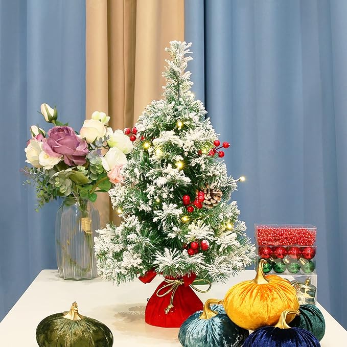 Sunnyglade 21.6 inch Snow Flocked Christmas Tree Artificial Mini Christmas Pine Tree Indoor Tabletop Ornaments Decorations with 30 LED Lights,Red Cloth Base and Pine Cones,White