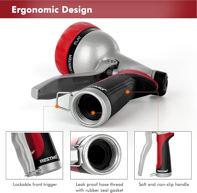 RESTMO Garden Hose Nozzle, Heavy Duty Metal Water Hose Nozzle with 7 Adjustable Spray Patterns, High Pressure Hand Sprayer with Flow Control, Best for Watering Plants & Lawns, Washing Cars & Pets, Red