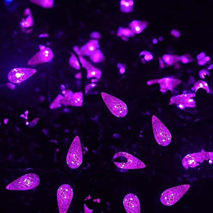 - [Halloween Decorative C6 String Lights]: With 100 Purple individual faceted strawberry C6 LED bulbs. Each Christmas light has end-to-end connection, you can connect up to 5 sets together to illuminate a wider range.