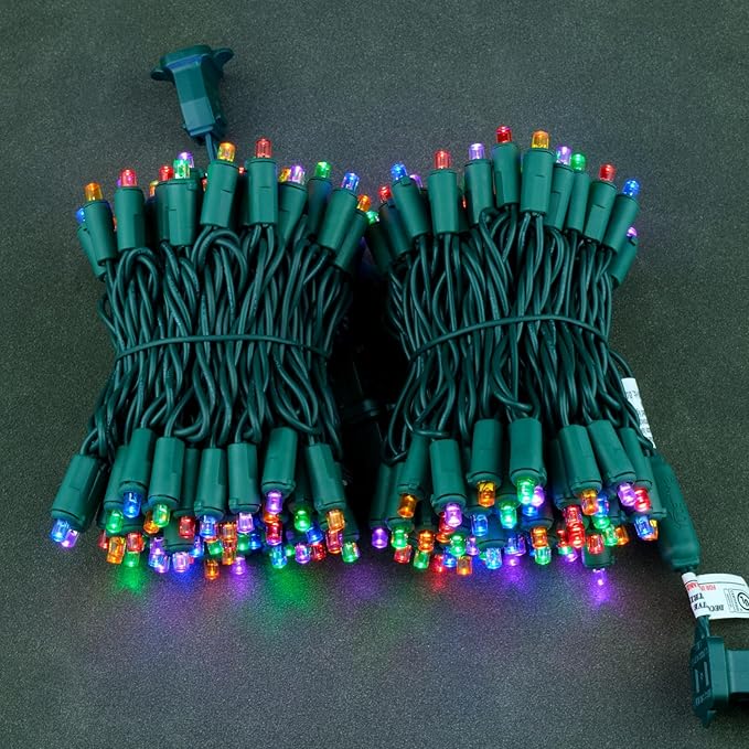 - 2 Strands In 1 Pack: 2 strands of 100 lights in one package. 51' total length with 200 multicolor LED wide angle lights. 25.5' per strand, 3" spacing, 4" lead, 4" tail. Whether you need an end-to-end connection or two separate strings, these lights have got you covered. Commercial grade 22 AWG wire with pure copper core. Indoor and outdoor use. For longer 66' string lights, please search for ASIN B07RSWWB8C.