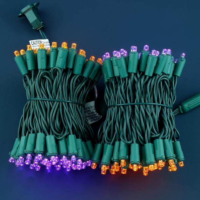- 2 Strands In 1 Pack: 2 strands of 100 lights in one package. 51' total length with 200 orange & purple LED wide angle lights. 25.5' per strand, 3" spacing, 4" lead, 4" tail. Whether you need an end-to-end connection or two separate strings, these lights have got you covered. Commercial grade 22 AWG wire with pure copper core. Indoor and outdoor use.