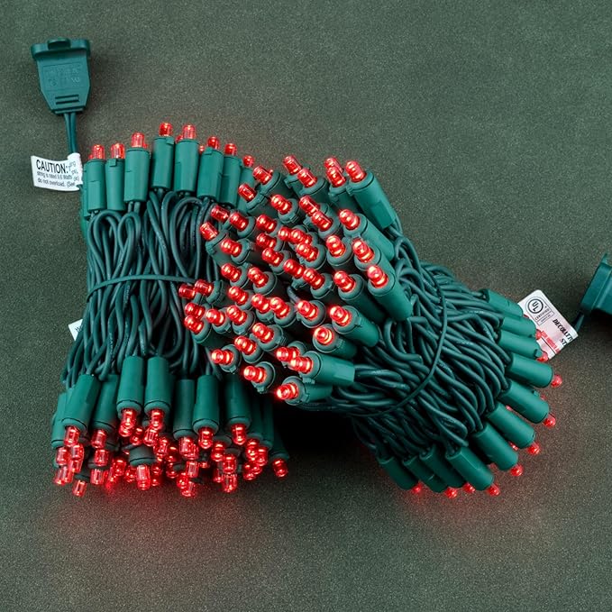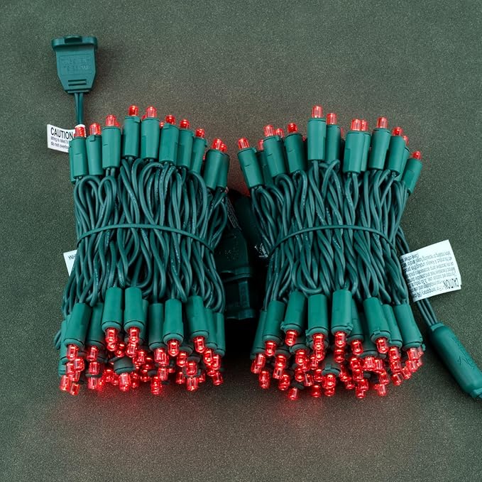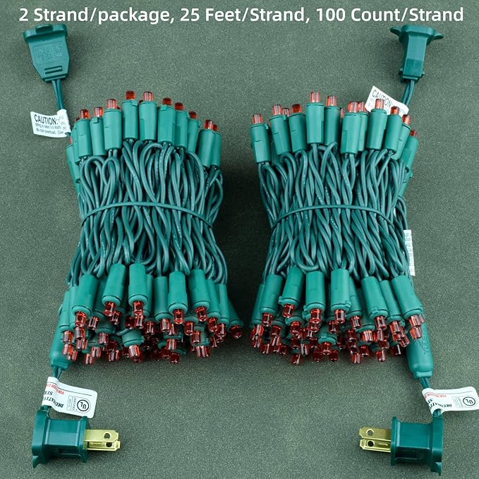 - 2 Strands In 1 Pack: 2 strands of 100 lights in one package. 51' total length with 200 red LED wide angle lights. 25.5' per strand, 3" spacing, 4" lead, 4" tail. Whether you need an end-to-end connection or two separate strings, these lights have got you covered. Commercial grade 22 AWG wire with pure copper core. Indoor and outdoor use. For longer 66' string lights, please search for ASIN B07PG9D6GY.