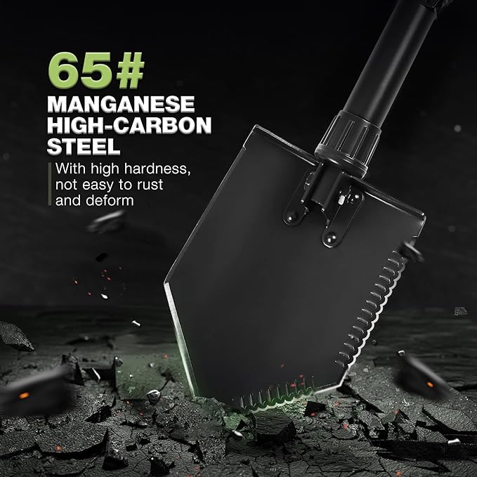 - High Quality Material: Our folding camping shovel is crafted from manganese steel, ensuring exceptional hardness, rust resistance, and durability to withstand harsh outdoor conditions.