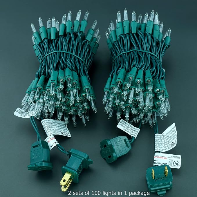 YULETIME 200 Clear Christmas Lights with Green Wire, Pack of 2 Strands of 21 ft 100 Count UL Certified Incandescent Mini String Light (Clear - Green Wire)
