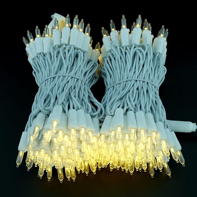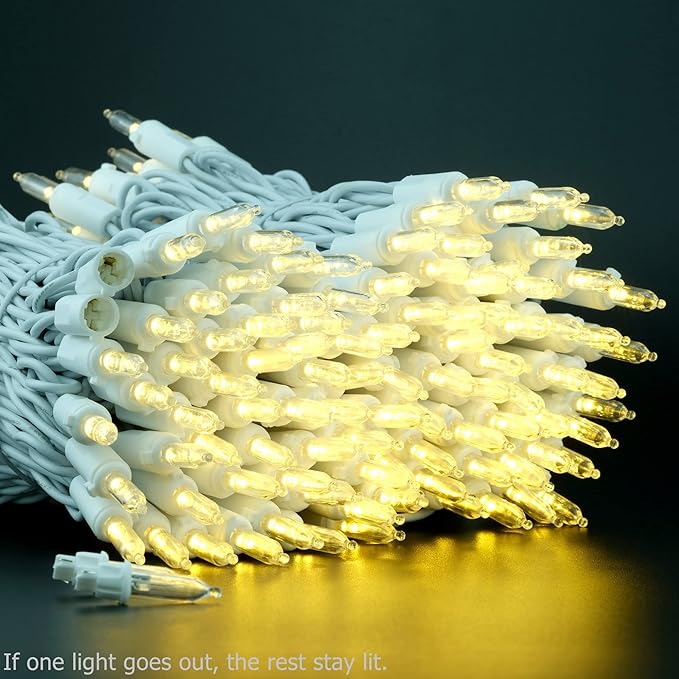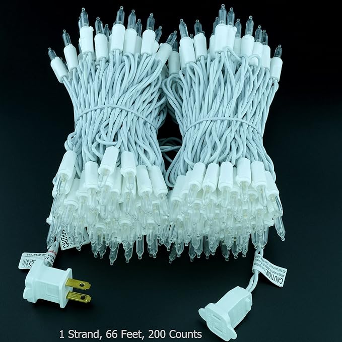 - Extra Long More Lights: 200 warm white LED bulbs on white wire, 1 strand total length 66 feet. 4-inch spacing, 4-inch lead, 4-inch tail. With a tangle-free design and robust commercial grade 22 AWG wire with a pure copper core, installation is swift and professional. Waterproof design allows it to be used indoors and outdoors. The versatility of our malleable string lights is limitless, adorn Christmas trees, railings, stairs, fences, bushes, or shape them creatively to match your décor.