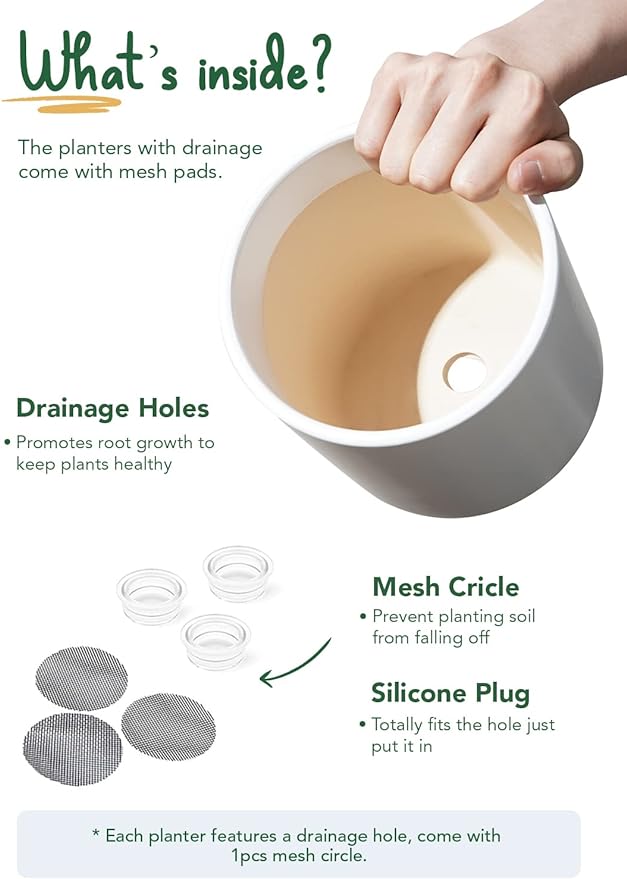 - Thoughtful Accessories: To drain or not to drain, it's all up to you; roots love moisture but are afraid of excessive water; use a silicon plug to prevent water leakage, or cover the drainage hole with a mesh pad to prevent soil loss, offering good ventilation for plants to breathe without restriction (Plant is NOT included)