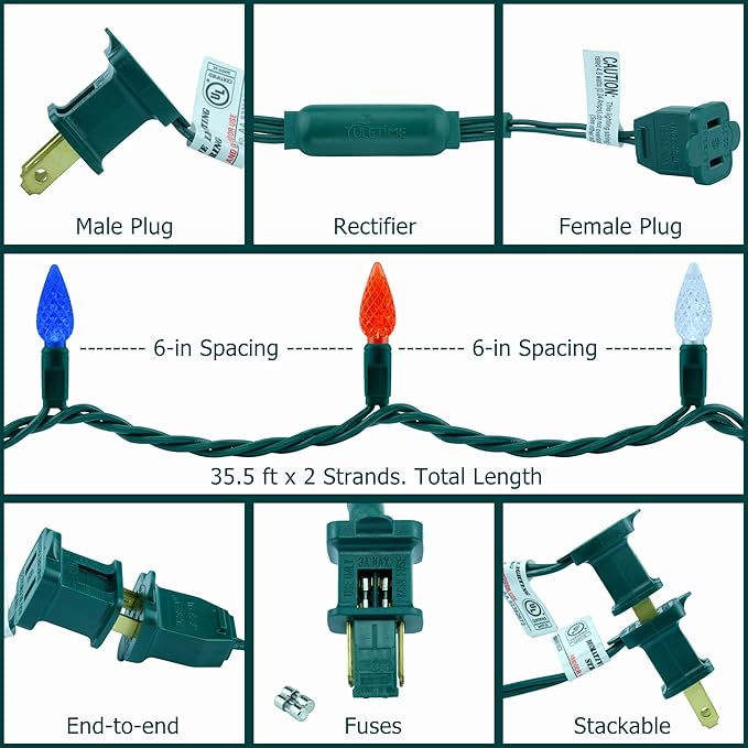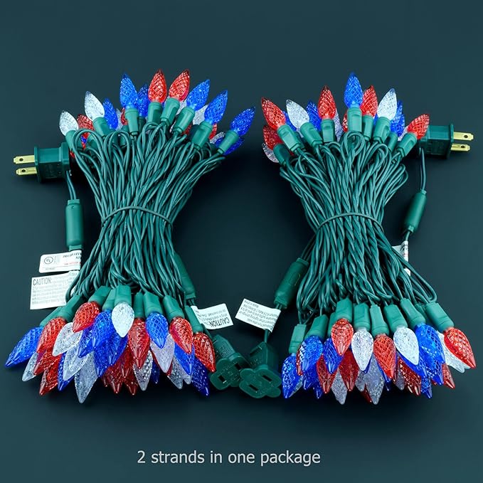 - 2 Strands In 1 Pack ♥ 140 count red, white and blue C6 Strawberry LED bulbs on green wire, 71 ft. total length. 2 strands of 70 lights in one package. 35.5-feet per strand, 6-inch spacing, 6-inch lead, 6-inch tail. It can be used with an end-to-end connection or two separate connections as needed.