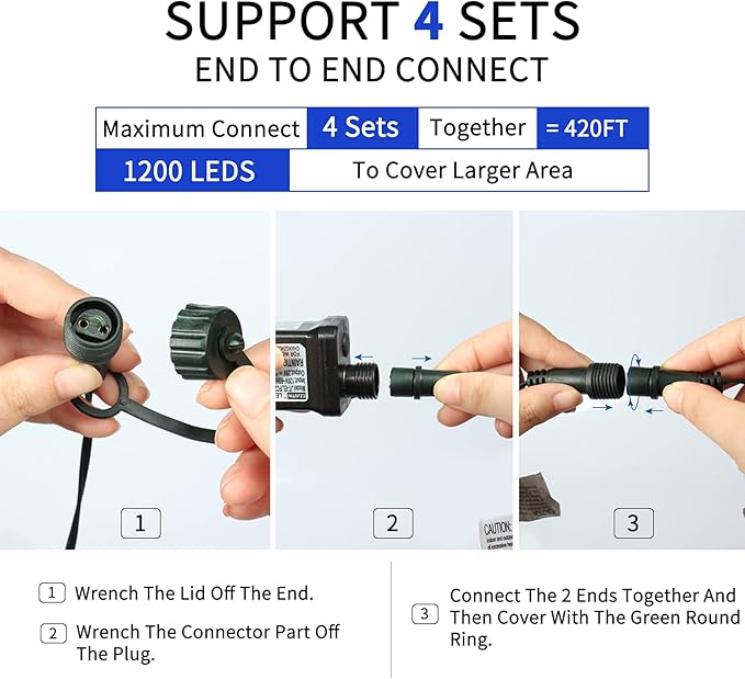 - 300led 105ft Blue Halloween Christmas Lights, Support 4 Sets End To End Connectable : Each Set Comes with 300 Blue Glow Leds On The 99ft Light Strand, You Can Buy 4 Sets To Connect Together, Total 396 Ft, 1200led Enough To Cover Larger Area.