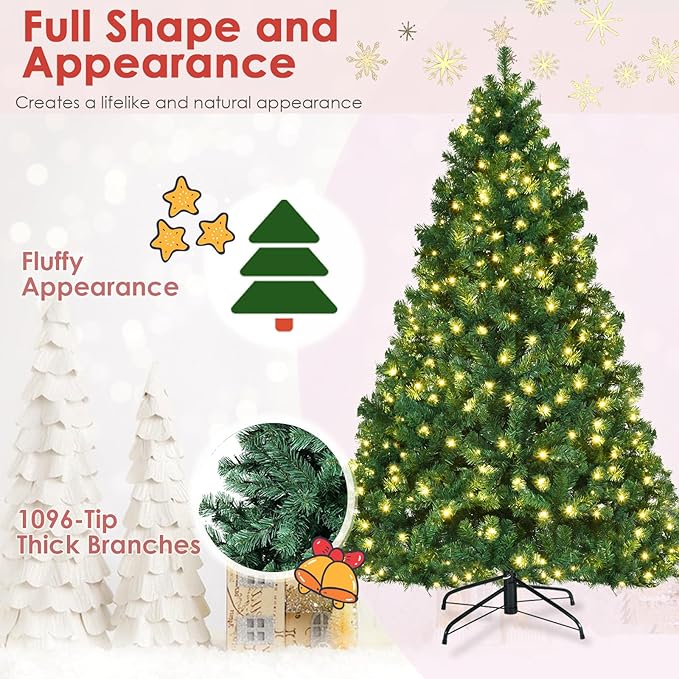 7ft Prelit Christmas Tree, Indoor Xmas Tree w/ 1096 PVC Branch, Pre-Strung 300 Warm White LED Lights & Metal Hinge,Easy Set Up, Artificial Christmas Tree for Home, Holiday, Party Decoration