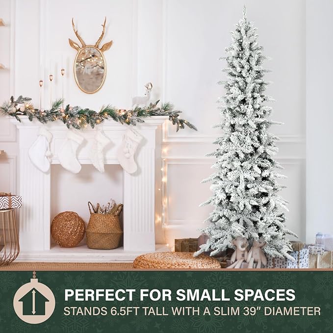 Fraser Hill Farm 6.5-Ft Slim Mountain Pine Flocked Artificial Christmas Tree with Stand, Unlit Foldable Skinny Fake Tree with Realistic Snowy Foliage, Holiday Décor Greenery for Winter Decoration