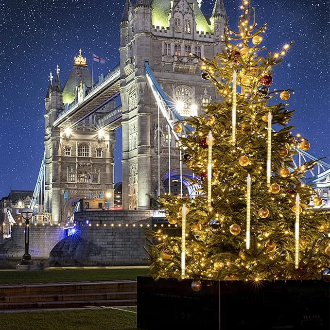 - Meteor Shower Falling Design: 8 icicles 288 SMD LED warm white falling lights are sure to bring brightness to your home outdoor Christmas decoration. Each LED on this raindrop lights will on and off one by one, the light drop at the same time and there will be a delay between each tube, just like a meteor shower or a snow falling across the Christmas night sky.