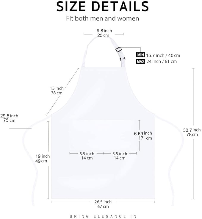 - 【Adjustable Length】: The apron suitable for both men and women (78*67 cm/30.7*26.5 inches), back strap extended to 75cm (29.5 inches).The neck strap is adjustable, which can be quickly adjusted to the required size, making it easier and faster to wear.