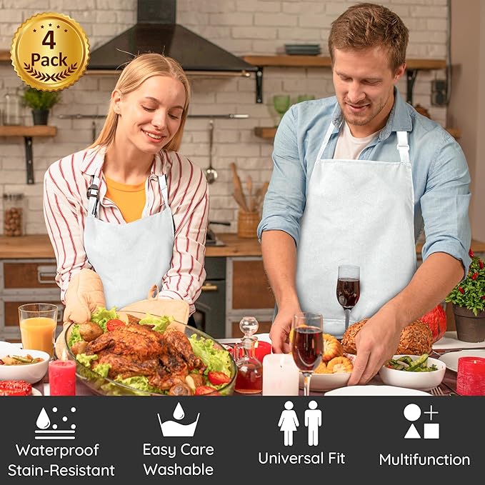 4 Packs Chef Apron, Waterproof Apron, Adjustable Aprons with 2 Pockets for Men Women, Professional Aprons for Kitchen Cooking Gardening Painting Baking Restaurant (White)