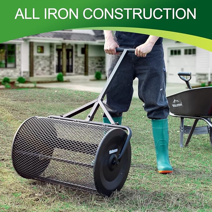 - MULTIFUNCTIONAL SPREADER: The peat moss spreader can break up the clumpy materials while tumbling, ensuring an even flow and spread of product on the lawn or garden. Its intensive mesh openings can leave the bigger chunks of debris in the spreader. This soil lawn spreader equably distributes compost, manure, dirt, peat moss, and other topdressing materials to plant, feed, and weed your lawn and garden.