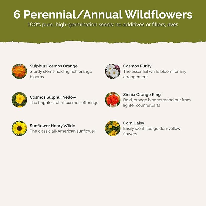 - 100% Pure, Non-GMO Seeds - No fillers, favorites only! Includes 6 easy-to-grow species: Cosmos Bright Lights, Cosmos Purity, Cosmos Sulphur Yellow, Zinnia Orange King, Sunflower Henry Wilde, Corn Marigold