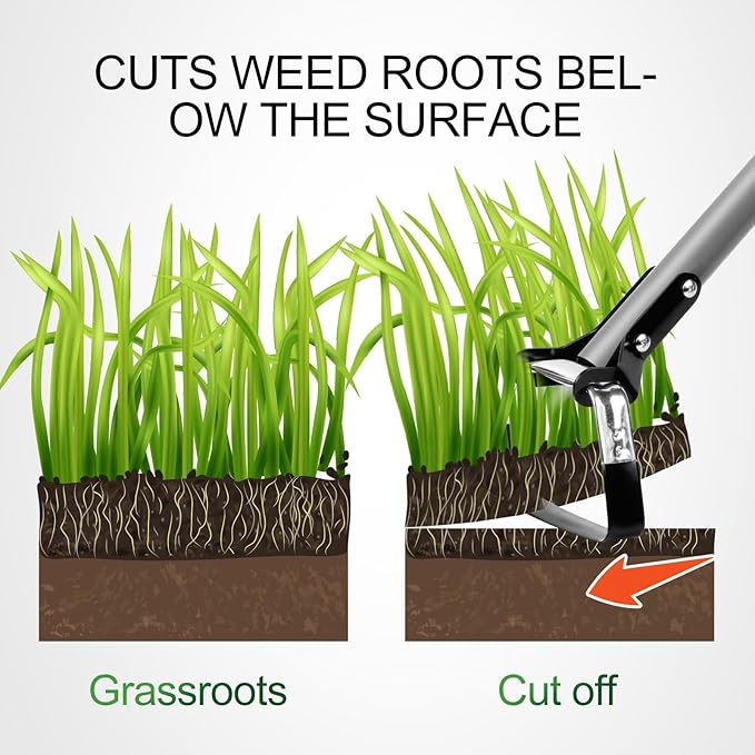 - High Quality Metal Material: The Garden Tool is made of high-quality and grade steel, hand-forged and welded and heat treated blade, which is sturdier and durable and made to last for years. The oscillating hoe uses push-pull motion to cut weed and shallow roots, it is more high-effectively.
