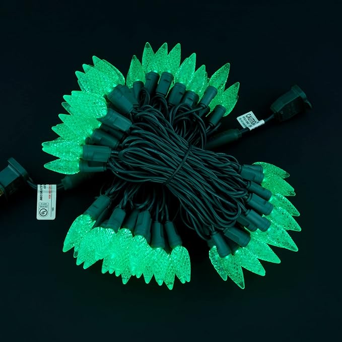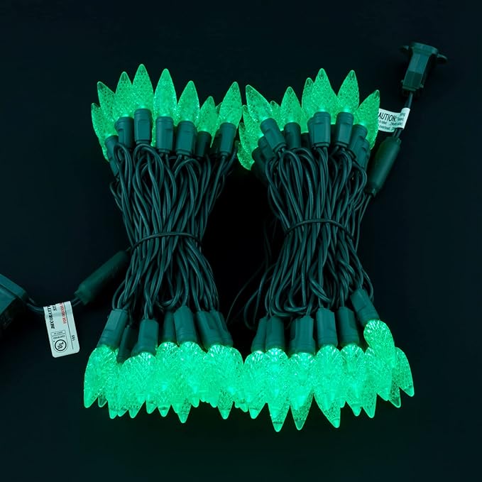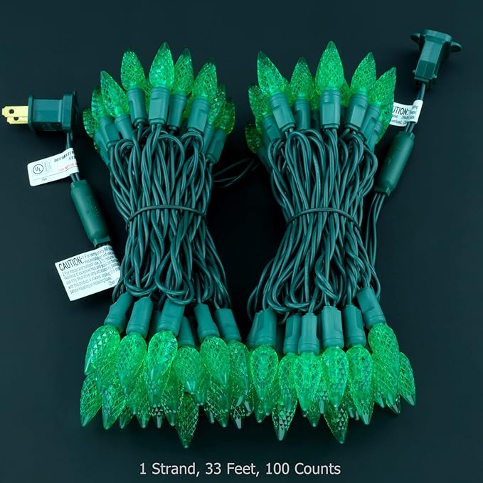 - Specifications ♥ 100 count green C6 strawberry LED bulbs on green wire, total length of lighted section is 33 feet, 4-inch spacing, 4-inch lead, 4-inch tail. Female plugs and stackable male plugs can be connected to provide extended use of end-to-end connections. The actual power of the whole string of lights is 7.2 watts and the rated maximum connected power is 216 watts with up to 30 strands running simultaneously.