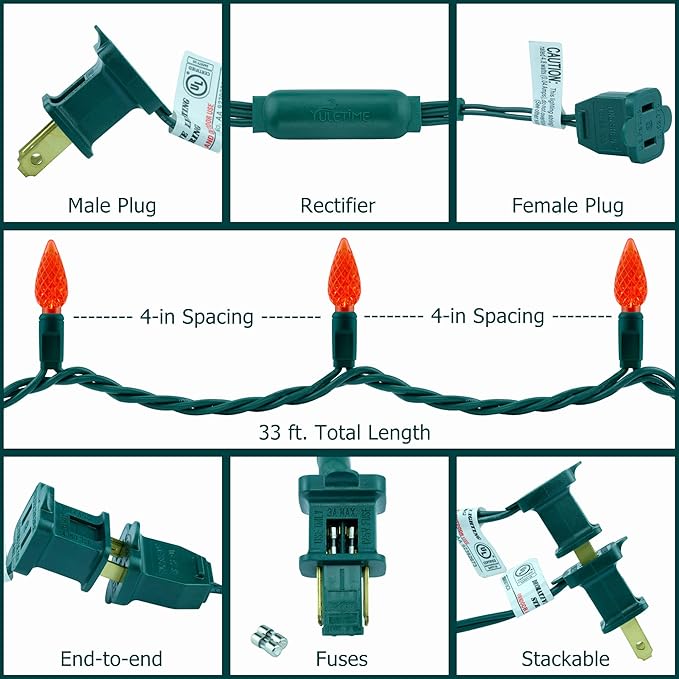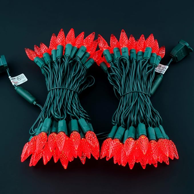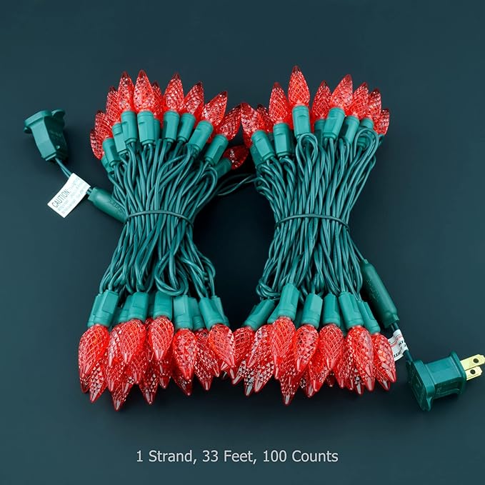 - Specifications ♥ 100 count red C6 strawberry LED bulbs on green wire, total length of lighted section is 33 feet, 4-inch spacing, 4-inch lead, 4-inch tail. Female plugs and stackable male plugs can be connected to provide extended use of end-to-end connections. The actual power of the whole string of lights is 7.2 watts and the rated maximum connected power is 216 watts with up to 30 strands running simultaneously.