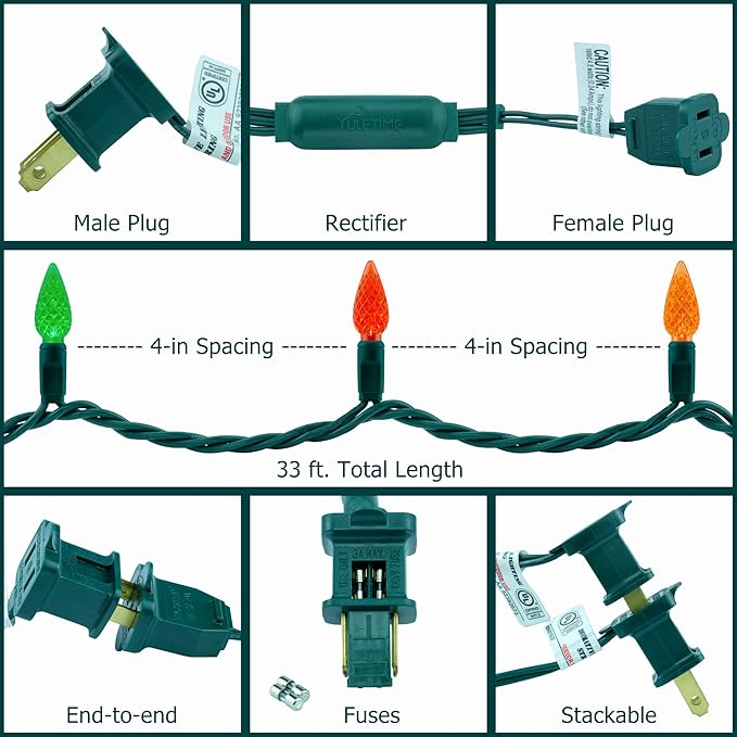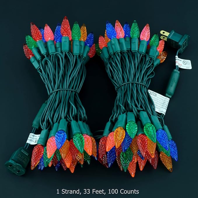 - Specifications ♥ 100 count multicolor C6 strawberry LED bulbs on green wire, total length of lighted section is 33 feet, 4-inch spacing, 4-inch lead, 4-inch tail. Female plugs and stackable male plugs can be connected to provide extended use of end-to-end connections. The actual power of the whole string of lights is 7.2 watts and the rated maximum connected power is 216 watts with up to 30 strands running simultaneously.