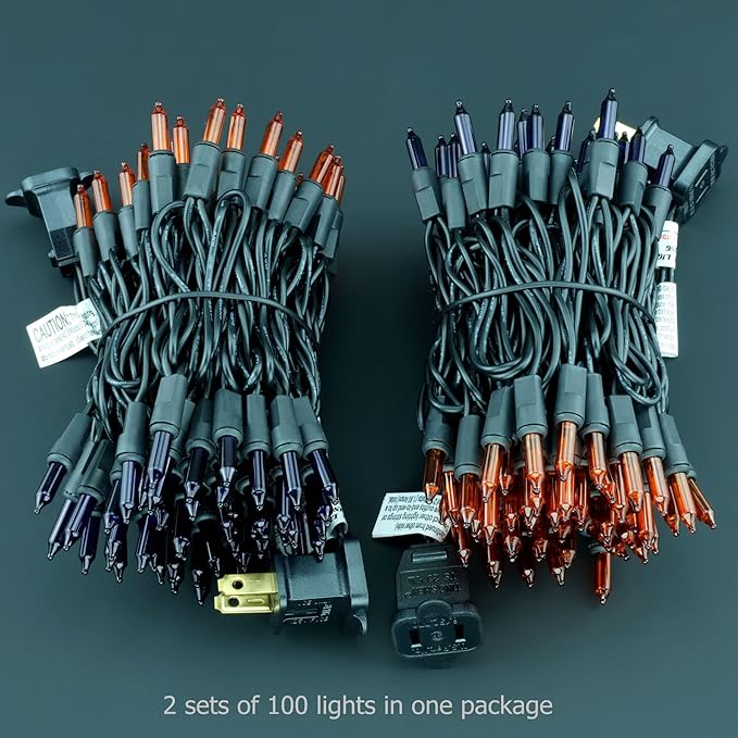 - Denser Lights Will Be Brighter: 200 orange and purple mini bulbs on black wire, total length 42 ft. 2 strands of 100 lights in one package. 21 feet per strand, 100 lights, 2.5 inch spacing, 4 inch lead, 4 inch tail. Same length, more dense lights, it makes the decor brighter.