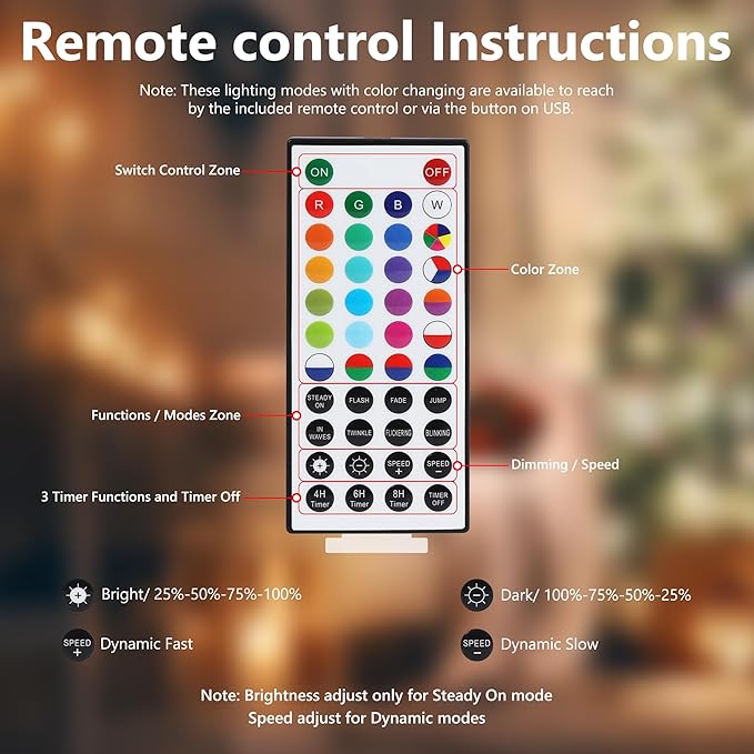 - 42-Key Remote Control: Use the remote to select colors, pick from 8 modes per color, adjust speed and brightness, and set a timer (4/6/8 hours). Remove the insulation sheet and aim at the green controller box when using the remote