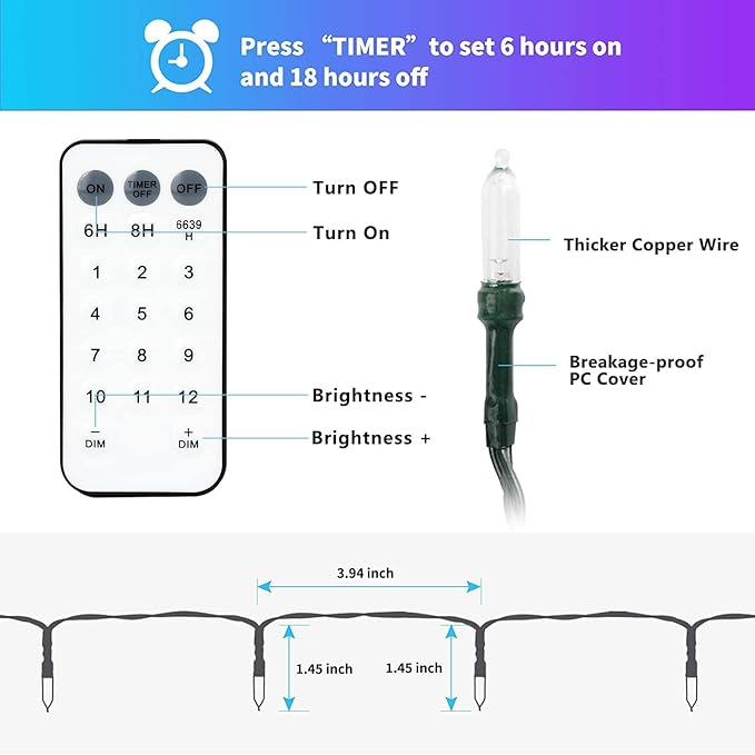 - Timer Function: To Avoid Forgetting To Turn Off The Christmas Lights,The Timer Function Of These Mini Lights Set Will Be Activated At The Time You Turn On The Lights,The Led String Lights Will Be 6Hours ON And 18Hours OFF Each Day Automatically