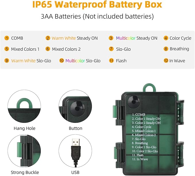 - 8 Modes Memory Function: Press The Button To Select The Mode:Combination,In Wave,Sequential,Slo Glo,Chasing/Flash,Slow Fade,Twinkle/Flash,Steady On.Timer Memory Function Will Be Activated As You Turn The String Lights On