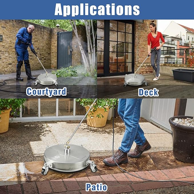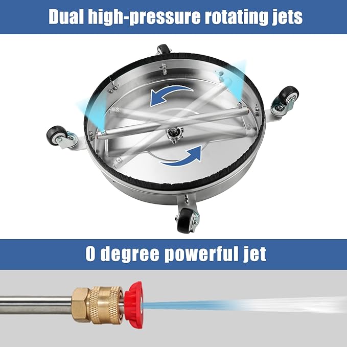 - HIGH EFFICIENCY - Our surface cleaner possesses dual high-pressure jets that spin rapidly to break up dirt and grime. And it cleans up to 6 times faster than a spray nozzle alone, markedly reducing the cleaning time. Streaks are eliminated by maintaining the nozzles at a fixed height from the surface. Equipped with 4 universal wheels, it is effortless to move.