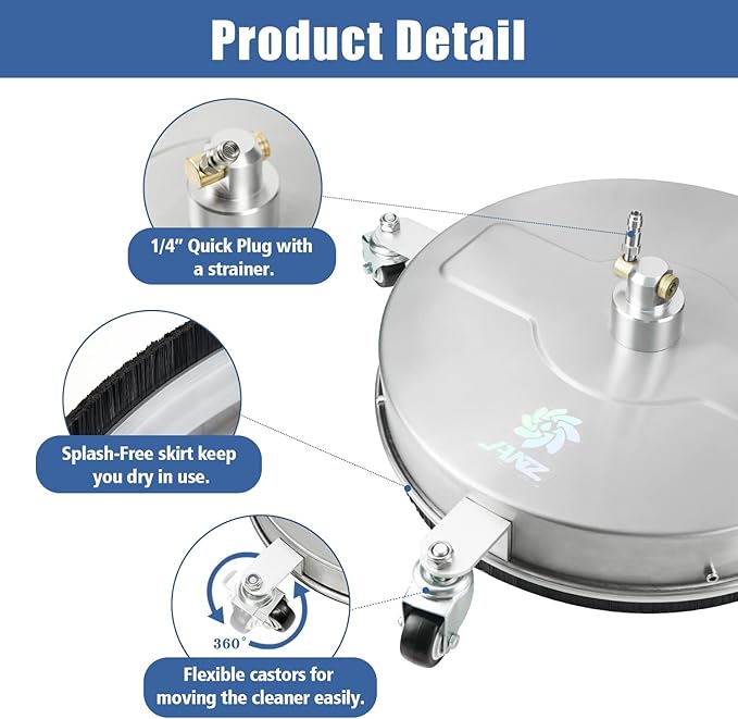 - PROFESSIONAL CLEANING - The JANZ surface cleaner offers commercial-grade cleaning within an area 17" wide, featuring two spinning nozzles rather than one and guaranteeing exceptional cleaning performance. It is extremely appropriate for removing stubborn stains on extensive surfaces such as driveways, patios, decks, sidewalks, and numerous others.