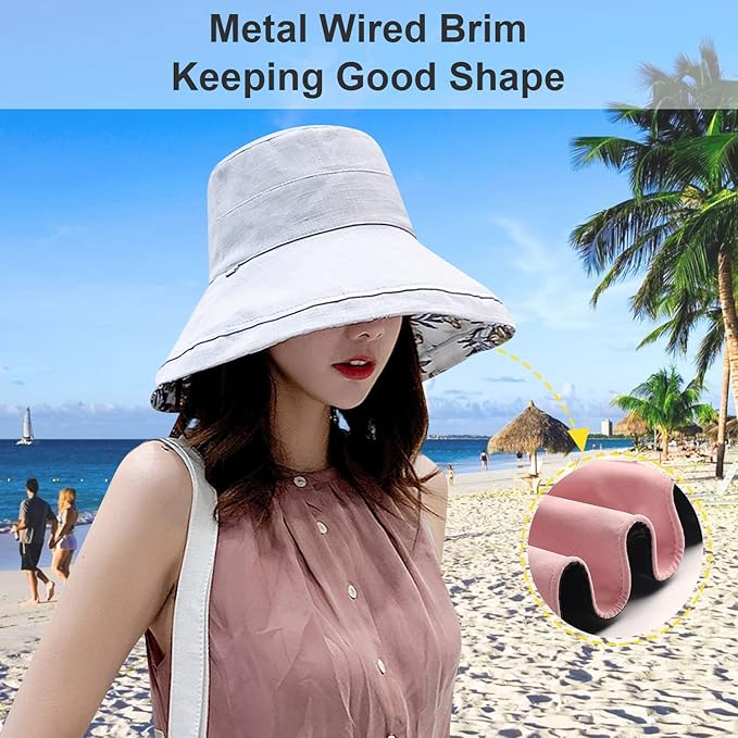 Women Wide Brim Sun Hats Metal Wired Edge Summer UV Protection Beach Fishing Hat for Hiking Garden Travel Chin Strap