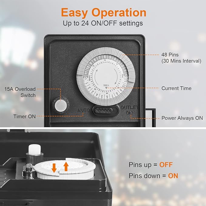 - Automatic 24-Hour Programmable Stake Timer: Features 48 pins for up to 24 ON/OFF settings at 30-minute intervals; Easily switch between Auto Timer and Power Always ON with a slide button; The schedule repeats daily, saving you time, power, and hassle