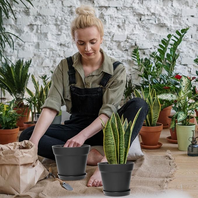 WOUSIWER 16 Pack 6 inch Plastic Planters for Indoor Flower Pots, Heavy Duty and Stylish 6 Inch Plant Pots for Indoor Plants with Drainage Holes and Tray for Plants, Flowers, Black