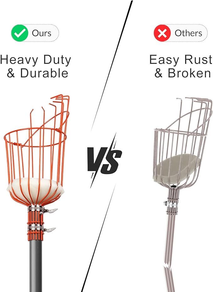 - High Quality and Durable: This fruit picker pole is made of rustproof high-quality stainless steel with power-coated, provides lightweight and laborsaving. Additional anti-pull screw and two metal ring to make the pole and fruit catcher more firmly connected and durable without bending, break or warping. The stainless steel basket with only 2.2 LBS is processed with anti-rust and anti-corrosion coating, sturdy enough to sustain fruits without deformation, bending or break.