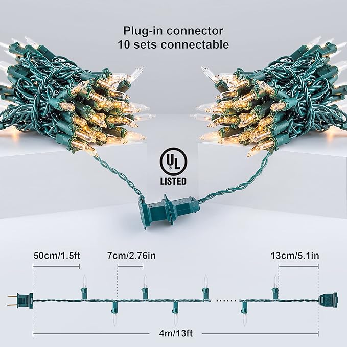 - 🌲Safe to Use : 50count warm white Christmas string lights are UL certified and the quality is guaranteed. Our Christmas strings lights have built-in fuses, which will protect the short circuit caused by the damaged wire and can effectively prevent the possibility of fire. High quality use rest assured. Warm tips: Please kindly protect these string lights from immersing in water and keep the plug dry.