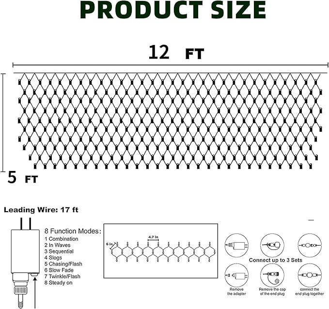 - Christmas Net Lights: Christmas 360 LED net lights, the size is 12 FT X 5 FT, the lead length is 16.5 FT, and the horizontal distance between each lamp bead is 4.7 inch. Place or hang the exquisite net lights on the trees, grass, bushes or any place you want, very easy to decorate. Designed with a green wire, these lights blend seamlessly into any Christmas trees and bushes, giving a natural and elegant look.