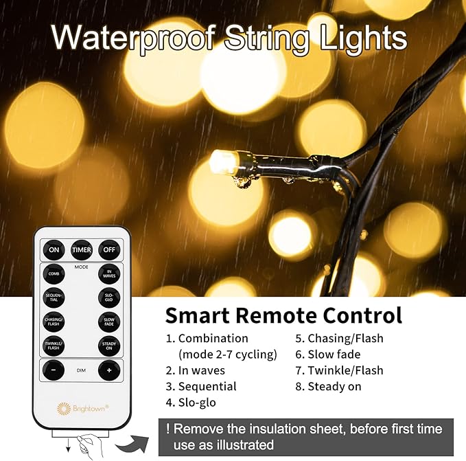 - 【8 Lighting Modes &Timer Function】The Christmas tree lights are available in 8 different lighting modes: Waves, Combination, Fading, Fireflies, Chasing, Twinkle, Fading slowly, and Steady-on. Each mode is so different which will make your Christmas tree and holiday more atmospheric! Different modes are controlled by the button on the plug.The Christmas lights also timing function, which automatically turns on for 6 hours and turns off for 18 hours.