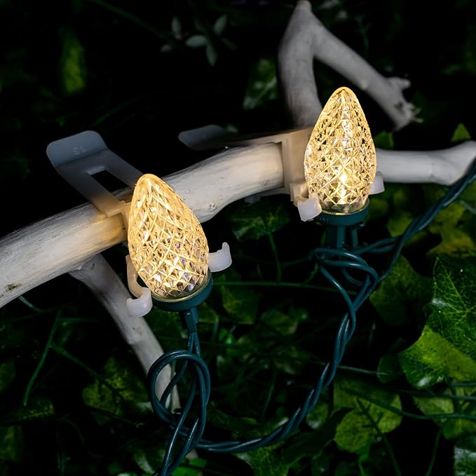 - Convenient Stable Setup and Removable All in ONe Clips: These energy efficient C9 LED Christmas lights come with 100 count white all in one clips for quick installation, offering the option of fastening easily and safely in a wider variety of settings, such as gutters, shingles, roofs, house, window or trees. The C9 light clips can also be easily removed if needed