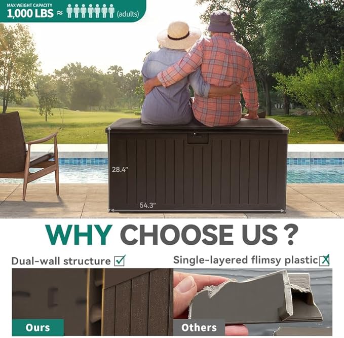 - IMMENSE STORAGE CAPACITY:This XL-sized outdoor storage box features a generous 150 gallon capacity; With dimensions of 54.3"L x 27.2"W x 28.4"H, the deck box offers ample space to accommodate both indoor and outdoor storage, great for cushions, tools, etc