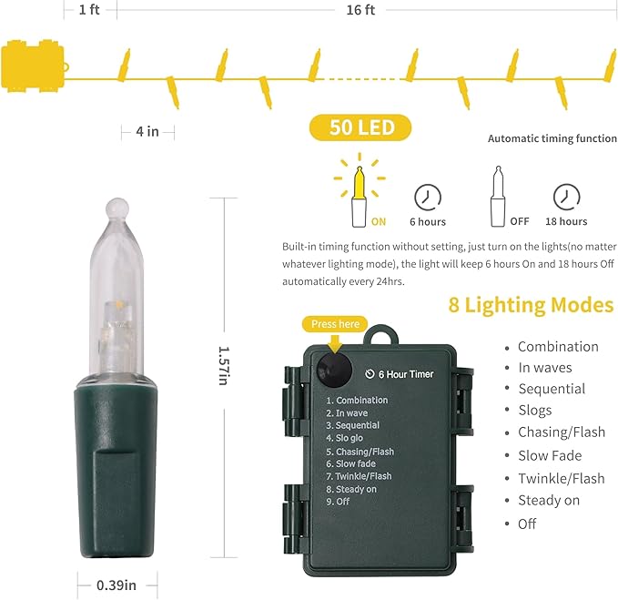 - [Timer Function]: Comes with built-in auto timer function(6 hrs ON, 18 hrs OFF), to avoid forgetting to turn off the Christmas lights. Just turn on the lights (any lighting mode) at 6 p.m. in the evening, and it will turn off at 12 a.m. at midnight, then auto on at 6 p.m. in the evening, this cycle repeats itself ad infinitum, no need to reset it everyday