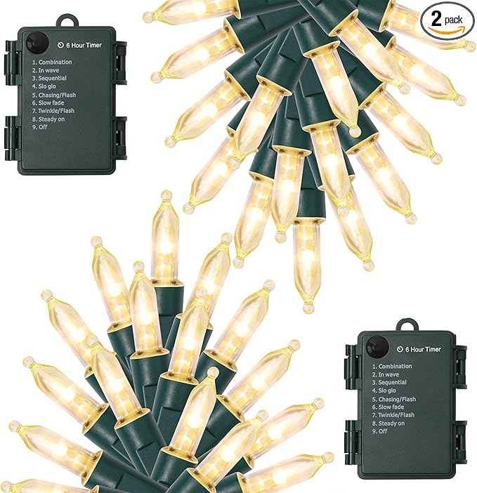 - [8 Lighting Modes]: WATERGLIDE 2 pack 50LED Christmas warm white mini string lights have 8 lighting modes for you to choose - Combination, In waves, Sequential, Slow Glow, Chasing/Flash, Slow fade, Twinkle/Flash, Steady on. Adjust the lighting modes by pressing the round button on the battery case