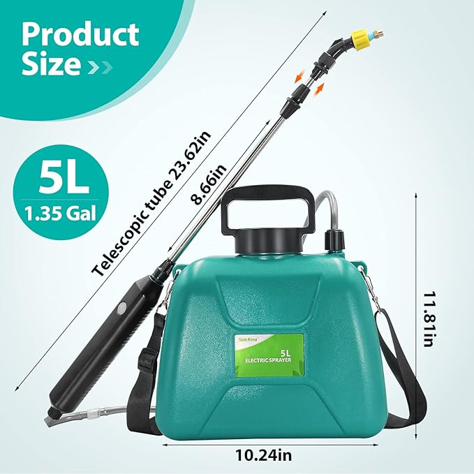 - Wide Applications: With a capacity of 5L/1.35 gallons, this battery sprayer is designed to meet your everyday needs, ideal for spraying all types of solutions both indoors and outdoor, plant watering or spraying, fertilization, herbicide, home cleaning, disinfection, and more. Any questions about products, please feel free to contact us, we are always here to help!