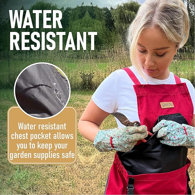 - Garden Apron With Water Resistant Chest Pocket - Our gardening apron has a chest lining that is made of waterproof material, which can keep your clothes stay dry and clean. The deep chest pocket has access on either side so you can easily store your phone or other garden gadgets.
