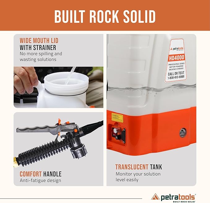 - American Family-Owned & 24/7 USA Support: Since 2019, PetraTools has been turning customers into fans with the durable, and long-lasting performance of our battery back pack sprayer 4 gallon. Backed by 100% customer satisfaction, we are ready to assist you 24/7.