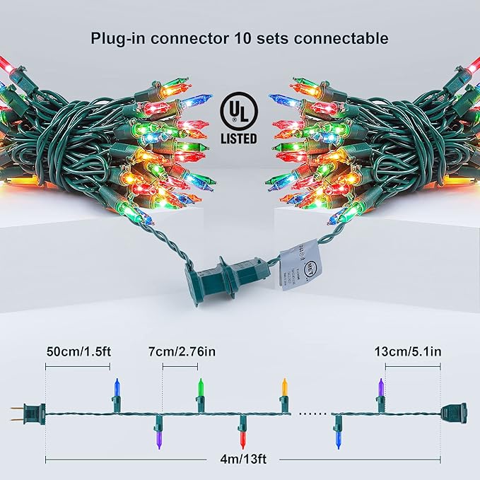 - 🎄Connectable Christmas Lights: Multicolor string lights can be End-to-End connected. Up to 10 sets,lighting range can be extended to 130ft. With this convenient function,you can do the DIY decoration on any occasions: shopping street, Christmas, music festival, birthday party, graduation party, garden, deck, bedroom.