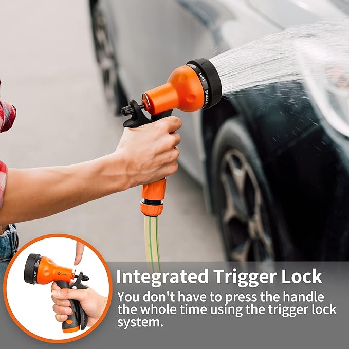 - LABOR-SAVING DESIGN: AUTOMAN garden nozzle features a nice lock bar at the top of the handle that keeps the water remains on without you having to apply any pressure.Just use the lock so you don't have to keep your hand holding it the whole time.