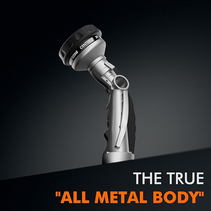 - 【Heavy Duty Metal Hose Nozzle】Constructed with premium zinc-alloy material, this hose nozzle sprayer is solid & strong to resist daily drops and shocks. The bronze powder painting, TPU coating and rubberized bezel dial can enhance durability & flexibility and withstand hard impacts & heavy force. A long-lasting garden hose nozzle you can count on many years.