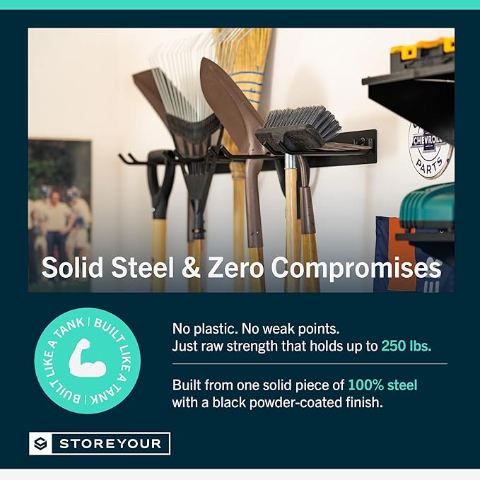 - ULTRA-STRONG & BUILT TO LAST – Made from 100% solid steel with no plastic parts or assembly required, this tool rack is crafted to withstand heavy-duty use. Each wall-mounted storage rack arrives fully welded and powder-coated to resist rust and corrosion. Perfect for organizing tools, outdoor storage gear, or even a fishing pole rack for the garage.