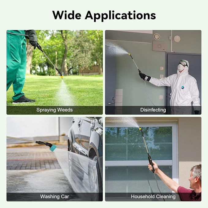- Portable Electric Sprayer, A Real Labor Saver - Quickly turn on/off with one button, no bulky water tank and manual pumping, free your shoulders and hands. This garden sprayer has a built-in 2400mAh rechargeable battery in the handle. Simply charge through the type-c port, a full charge can last up to three hours of continuous use.